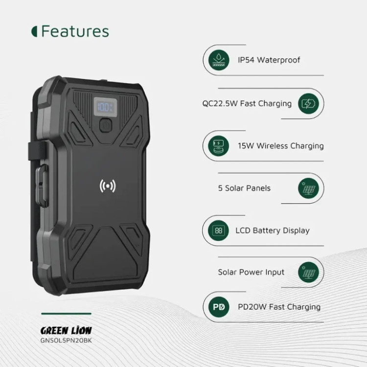 پاوربانک Green Lion Solar 5 ترکیبی از قدرت، دوام و انعطافپذیری است. ظرفیت بالای 20000 میلیآمپر ساعت باعث میشود حتی در سفرهای طولانی، چندین بار گوشی، تبلت یا سایر دستگاههایتان را شارژ کنید.